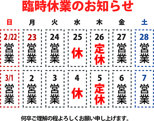 お知らせ NEWS 2026.02.20 臨時休業のお知らせ 誠に勝手ながら2/25(水)と3/4(水)は臨時休業日とさせていただきます お客様にはご迷惑をおかけいたしますが何卒ご理解のほど宜しくお願いいたします 新町焼肉ハウス・オー 店長 新着情報一覧